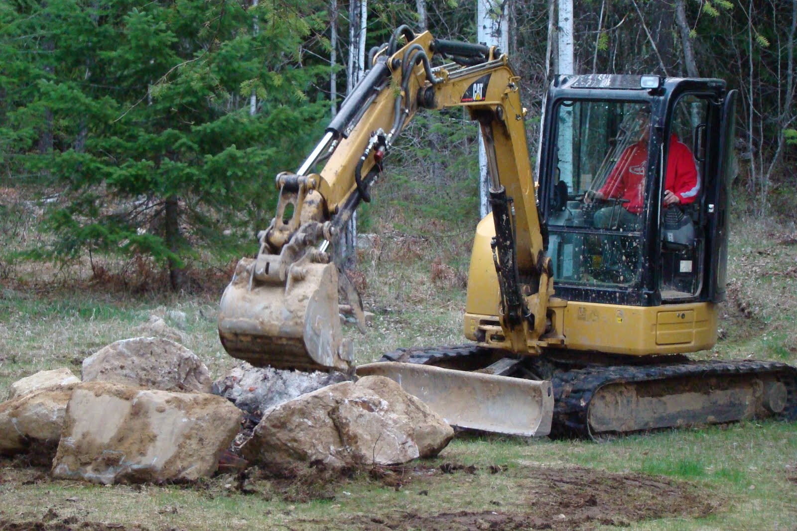 I told you that the water is plumbed to the house, but that includes a lot of trenching and pipe-laying that was accomplished. When our dirt-guy couldn't make it up again for a couple weeks, he offered to let AJ use his Back Hoe (if you can imagine a little boy getting a BB gun for Christmas...), so AJ has been moving some boulders to various parts of the yard. Our campfire pit now has some awesomely big rocks around it!